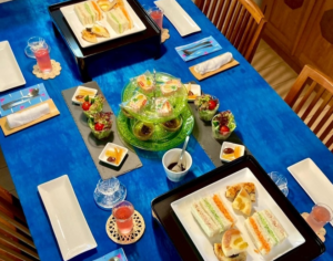 今回は暑すぎて料理は無しにして、アフタヌーンティーのような簡単な軽食をお出しして、お茶と一緒にご歓談頂きました。